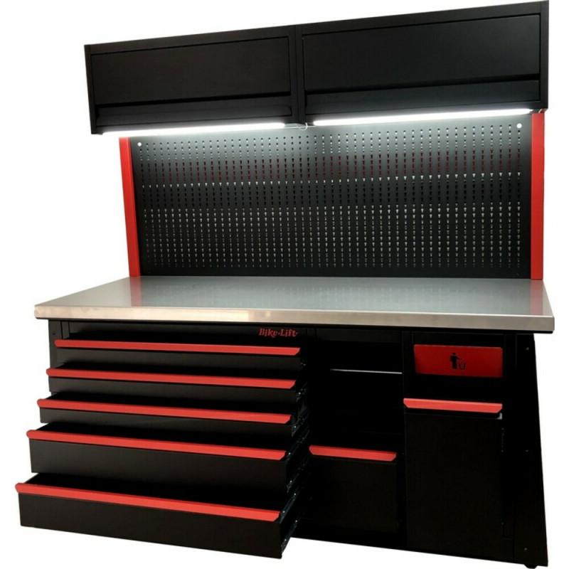 Dies Der Arbeitsplatz ist speziell auf die Welt der Fahrräder abgestimmt, 2 m breit, mit einer Arbeitsplatte aus Eisen und einer Schutzabdeckung, einer großen Lochplatte für Werkzeughalter und 2 großen Oberschränken mit Falttüren mit hydraulischem Kolbensystem. Er bietet einen großen Arbeitsbereich, der von 2 leistungsstarken LED-Lichtleisten beleuchtet wird.