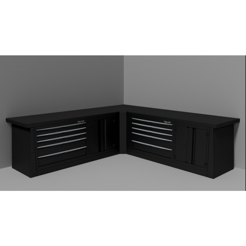 Corner furniture unit assembles two Bike Lift workshop furniture (89080002, 89080003, 89080004) for an L-shaped configuration.