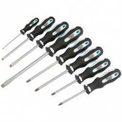 Destornillaodres de calidad SVCM+ templados y cromados con puntas arenadas. Fijadas a un mango de agarre suave, resistente al aceite y a los disolventes, codificado por colores. Se suministra en estuche de PVC.