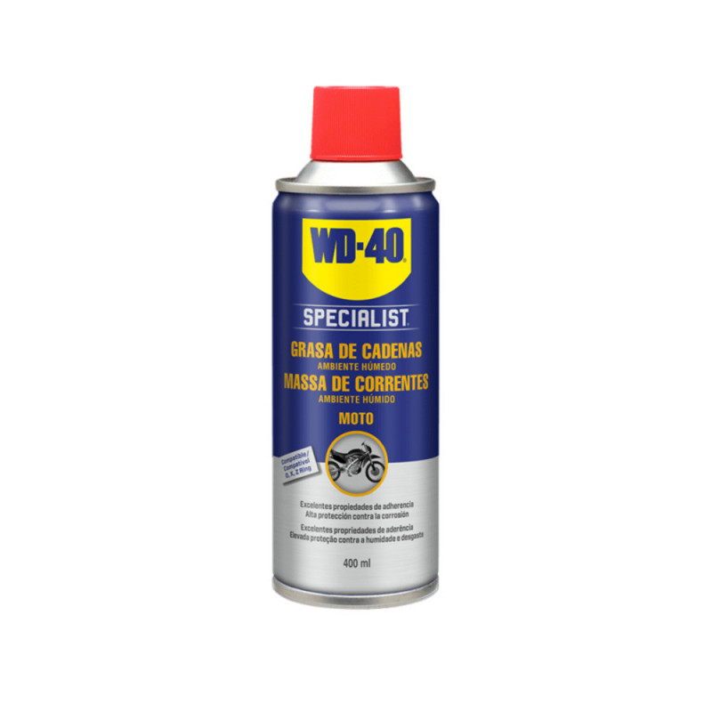 La grasa de cadenas WD-40 Specialist Moto ofrece una protección y lubricación duraderas para la cadena de la moto y es ideal para ambientes de alta humedad.
