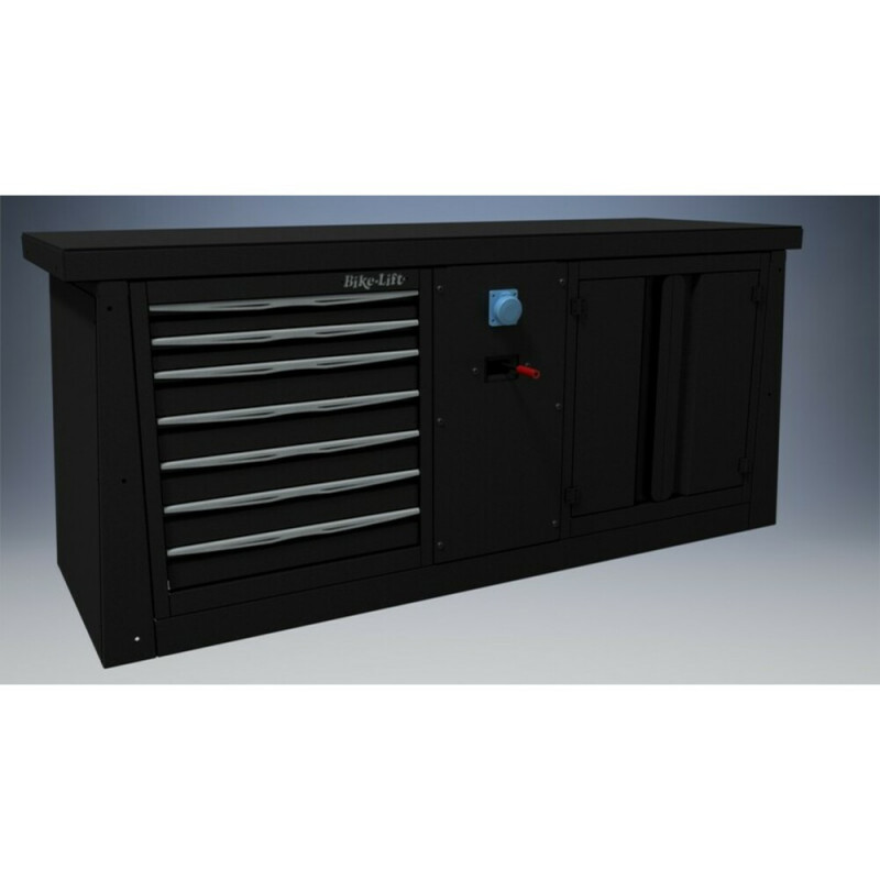 Organízalo todo a tu medida gracias a estos 3 módulos para taller. Cuenta con cinco cajones, toma de aire/electricidad y una cabina inferior. Espacio para colocar tornillo de banco. Cajones 100% retráctiles. Color: negro y plata.Peso: 200 kg Made in Italy Garantía de 2 años. Medidas del mueble (largo x ancho x alto): 200 x 80 x 90 cm Espacio útil de los cajones: Dos cajones de 59x41x9 cm y cinco de 59x41x6 cmMedidas de la cabina: 62x41 cm Se le pueden añadir otros dos módulos, con un panel de unión o una esquinera. Panel de unión: 89080007 o 89080008 Esquinera: 89080005 o 89080006