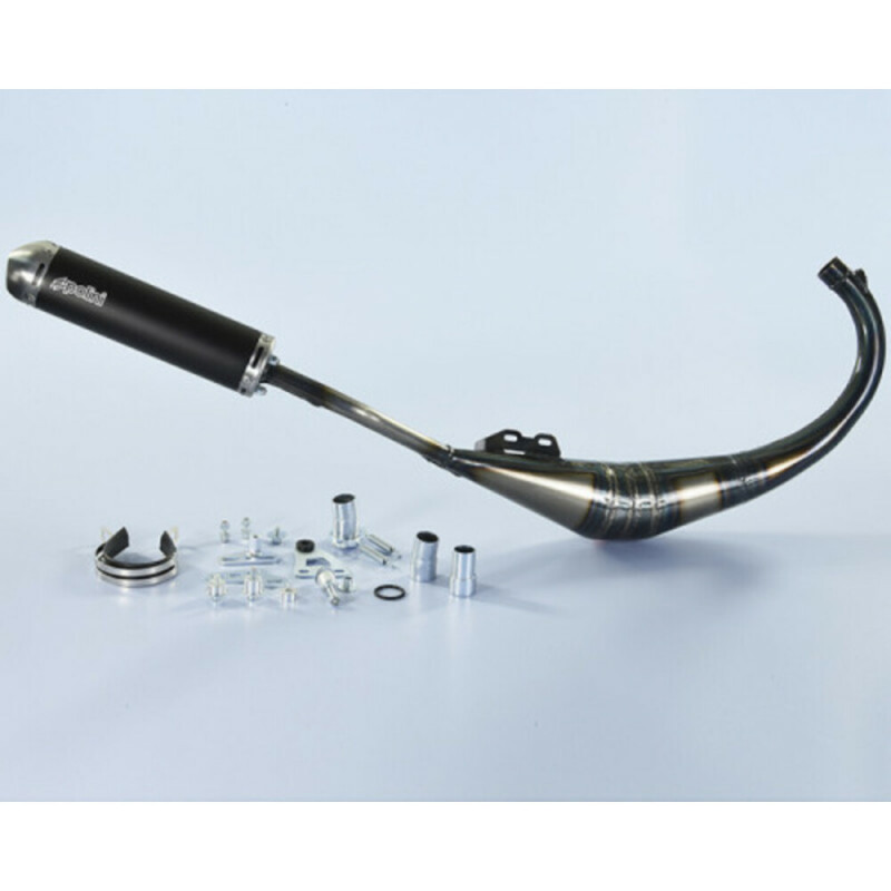 Característica de los escapes Evolution es la línea de paso bajo, que ha permitido aprovechar al máximo las dimensiones de los conos de expansión para obtener el mejor rendimiento tanto de los motores originales de 50cc. como de los motores modificados de 80cc. exclusivamente para uso en competición.