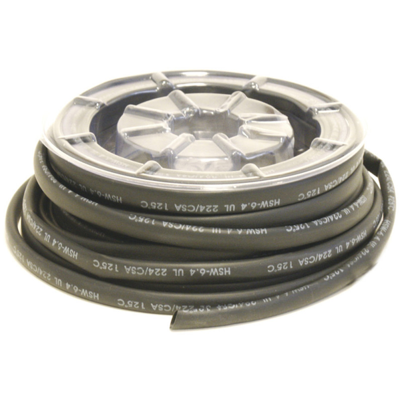 Bobina de manguera termorretráctil negraLongitud: 12 mDiámetro en frío: 6'4 mmCoeficiente de retracción: 2/1Temperatura de retracción: 90° CDiámetro tras retracción: 3'2 mmTemperatura operacional: -55°C a 125°CHecha de poliolefina irradiada