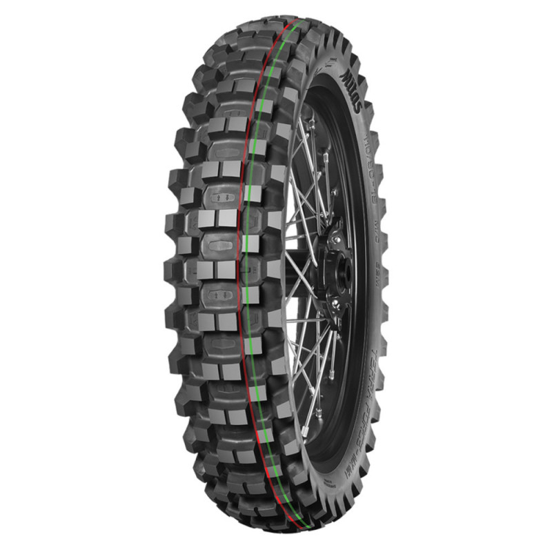 Medium-Hard Terrain - Identified by the characteristic red + green stripe: Motocross competition tire made from the softest tread compound for medium to hard terrain.