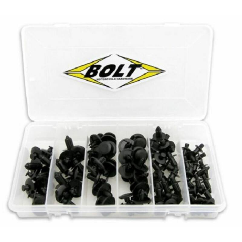 Assortiment de rivets en nylon pour motos et scooters. Le kit comprend différentes tailles et formes (M6, M7, M8). Dix unités de chacune de ces pièces : Rivets nylon, M6 : 893452 Rivets nylon, M6 : 893516 Rivets nylon, M7 (2 modèles) : 893384 Rivets nylon, M8 : 893473 Rivets nylon, M8 XL : 893414