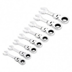 Draper Las llaves combinadas métricas HI-TORQ® de carraca con cabeza flexible están forjadas en acero al cromo vanadio endurecido, templado, totalmente pulido y cromado espejo para proteger contra la corrosión. El extremo abierto está desplazado 15°. El extremo anular con cabeza flexible de 180° tiene un mecanismo de carraca de 90 dientes que permite un movimiento de 4°, lo que permite su uso en espacios reducidos. El sistema HI-TORQ® de 12 puntos proporciona el máximo apalancamiento transfiriendo el par de apriete a las caras planas y evitando que el tornillo resbale o se dañe. Este juego de ocho piezas contiene los tamaños más habituales. Se suministra en una funda Tetron.
