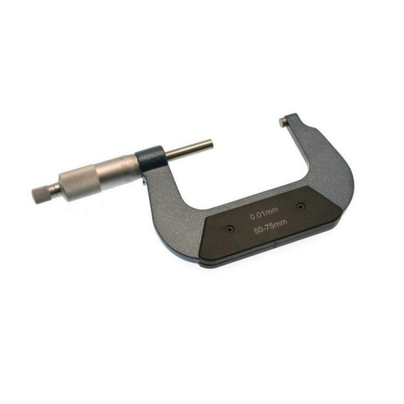 Micrometro per esterni con superficie di misura controllata a cricchetto e sistema di bloccaggio. Gamma: Punte da 50 a 75 mm. Precisione: 0,01 mm (1/100 di pollice). Contiene: