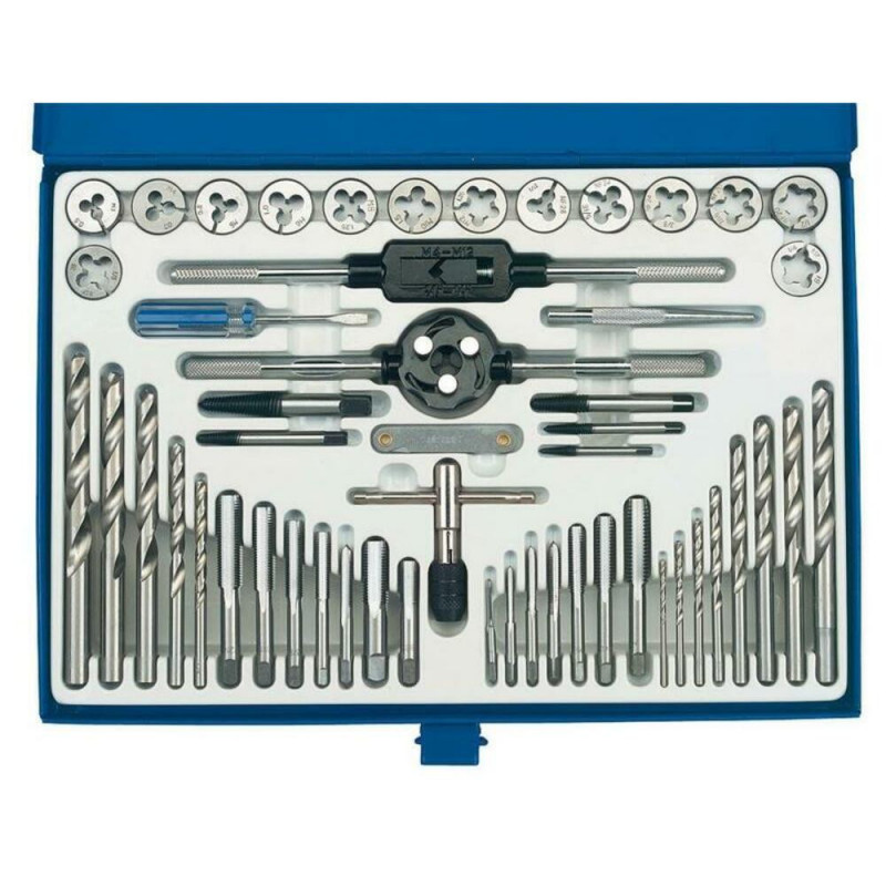 Machos e matrizes (sistemas métrico e imperial), com ferramentas Sistema métrico: Diâmetros de M3 a M12 3x0'5 - 3'5x0'6 - 4x0'7 - 5x0'8 - 6x1 - 8x1'25 - 10x1'5 - 12x1' 75 Sistema Imperial: Ø1/4 5/16, 3/8, 7/16, 1/2, 1/8, 1/4 Contém: 7 machos métricos e 7 imperiais. 7 matrizes métricas e 7 imperiais. 13 brocas: 2'5 - 3'3 - 4'2 - 5 - 5'5 - 6'8 - 6'9 - 8'5 - 8'8 - 9'9 - 10'3 - 11'4 - 11'8mm. 5 extratores de parafuso. 2 torneiros masculinos. 1 porta-matriz. 1 medidor de linha. 1 soco. 1 x chave de fenda. Rosca UNF e BSP.