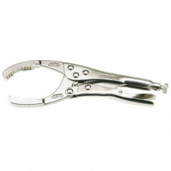 Alicate multifuncional autotravante para filtros de óleo, com abertura regulável e alavanca de liberação rápida. Forjado em aço cromo-vanádio, temperado e revenido, com acabamento em níquel. Capacidade de abertura: De 53 a 118 mm